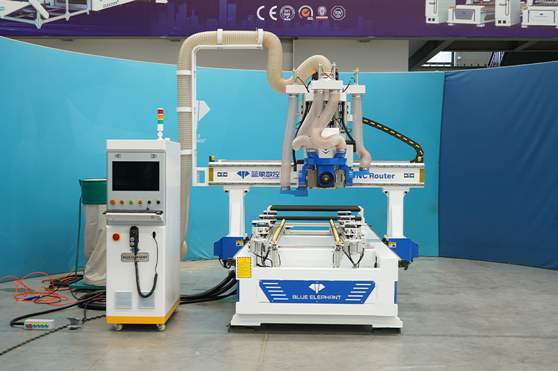 門(mén)鎖機(jī)由兩個(gè)垂直主軸、四個(gè)水平主軸(可自由切換角度)、可調(diào)夾具工作臺(tái)、輔助上下料裝置等部件組成,木門(mén)裝夾方便,多把刀自由切換功能強(qiáng)大。設(shè)備操作簡(jiǎn)單便捷,系統(tǒng)功能強(qiáng)大,含有健全的CAM軟件,輕松完成木門(mén)鎖孔、鎖槽、合頁(yè)面、油漆孔、滑道槽等工藝的加工。