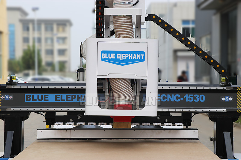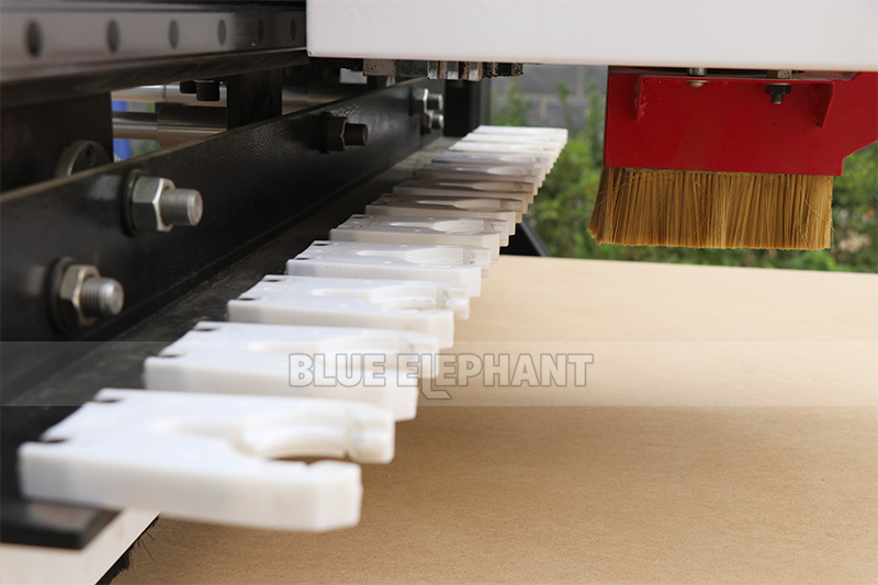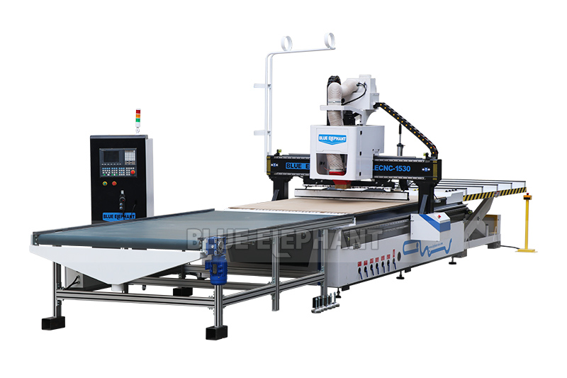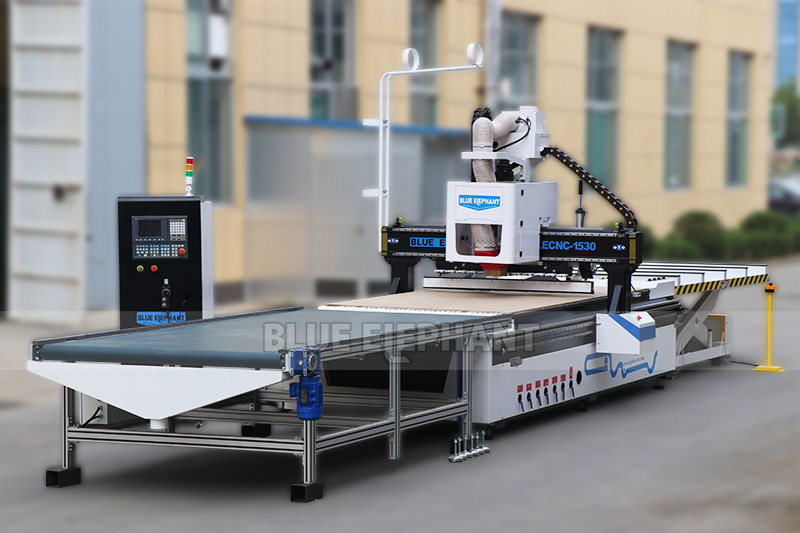 自帶推料裝置,加工完成自動將板材從加工臺面推下,方便操作人員取料,并省去怠工時間,效率高。