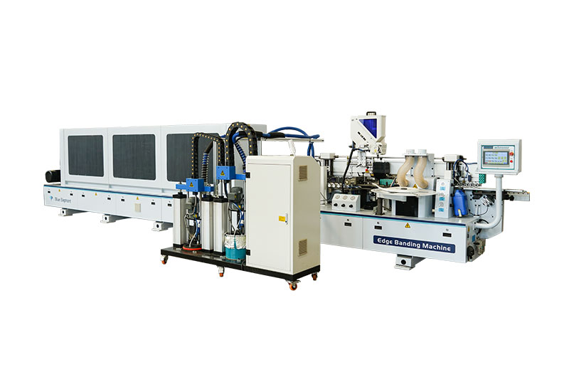 E-70JDSR全自動封邊機(jī)功能:前分離-預(yù)銑-涂膠貼邊1-涂膠貼邊2-齊頭-手動粗修-手動精修-跟蹤倒角-刮邊-平刮-后清洗-拋光1-拋光2