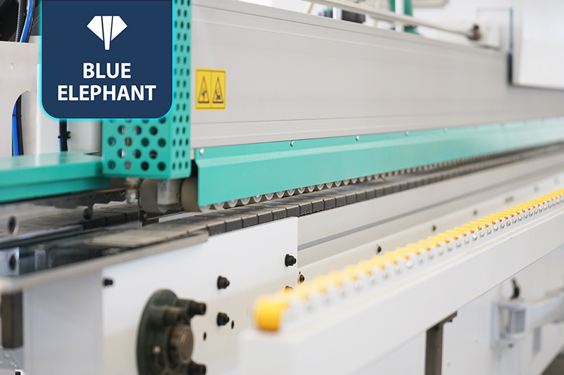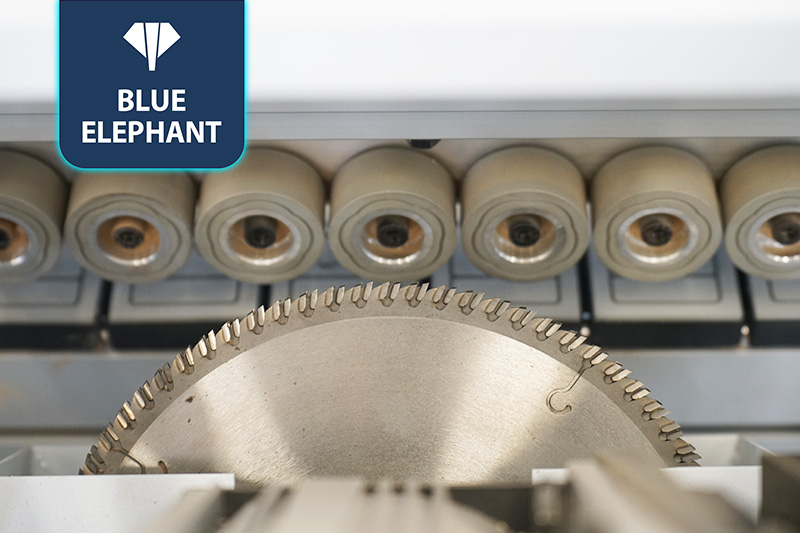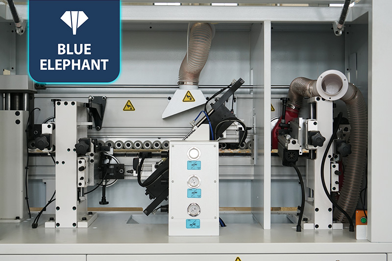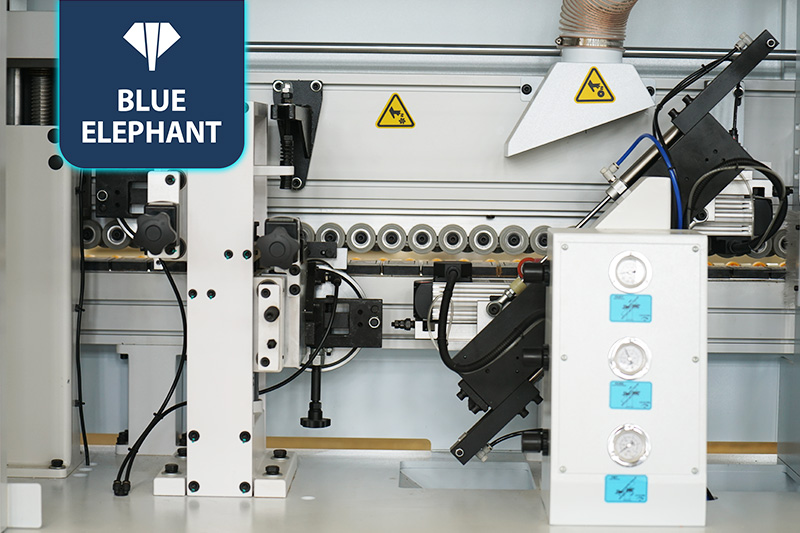 該設(shè)備采用45°斜邊鋸,使直板進(jìn)入板材進(jìn)行切割銑型成45°斜邊,通過(guò)斜直膠鍋和斜直一體壓貼,使封邊帶與斜直邊板材粘合更緊密。